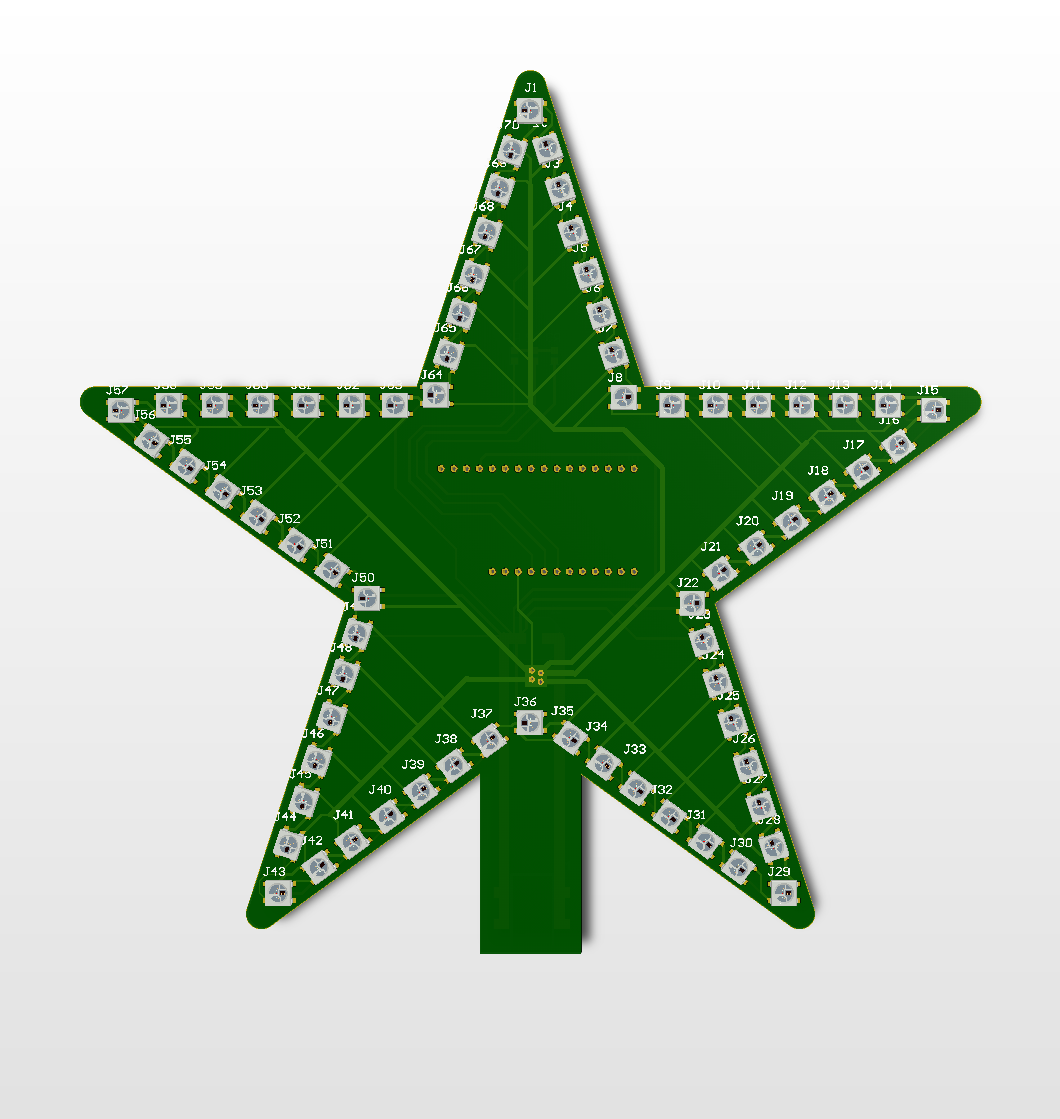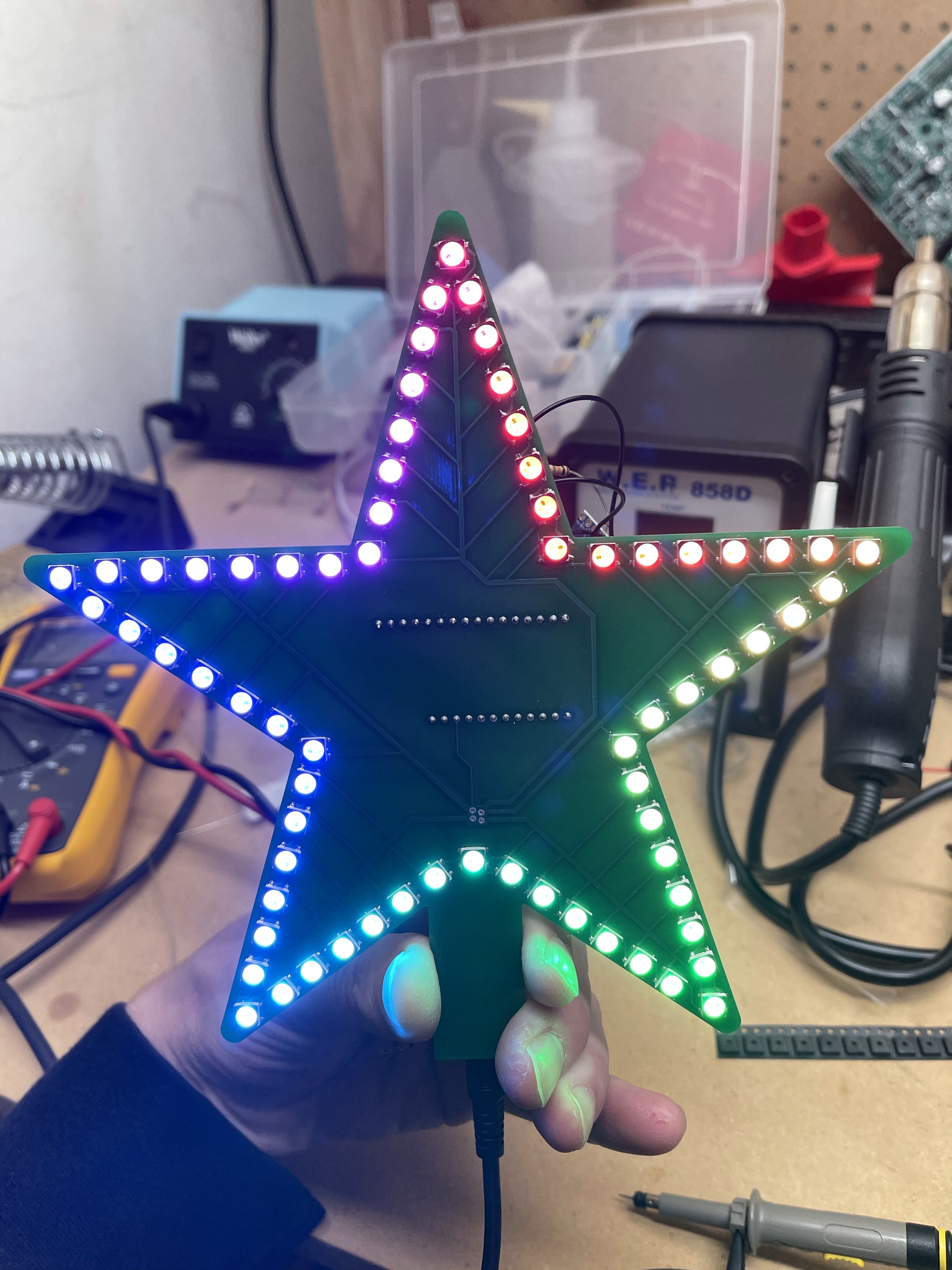 Draw 8in star in CATIA, import to Circuit Maker, design schematic and layout, 10 day turnaround PCB 2oz copper and 2mm FR4 board, hot air solder with low temp solder paste, HazzahESP32 for wireless OTA programming, 70x Neopixel RGBW individually addressable LEDs, and program to rotating rainbow pattern!